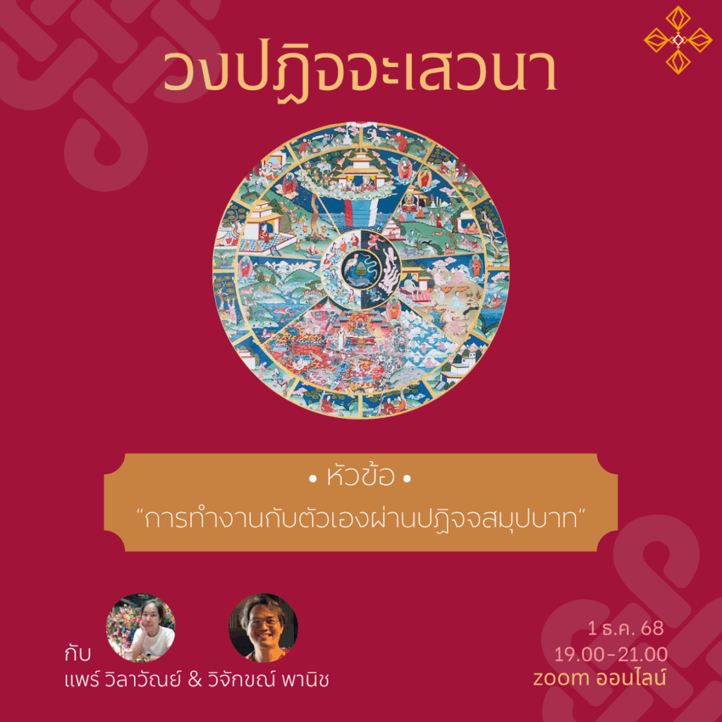พบกันเดือนเว้นเดือน กับวงเสวนาแลกเปลี่ยนพูดคุย ถึงแง่มุมของคำสอนปฏิจจสมุปบาทที่สัมพันธ์กับการภาวนา สำรวจหลากมิติที่กงล้อปฏิจจสมุปบาทสามารถประยุกต์เข้ากับวิถีของการฝึกสติ และชีวิตประจำวันของเรา