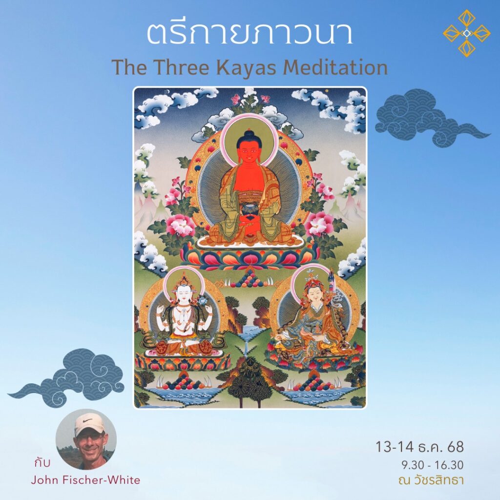“ตรีกาย” หรือ กายทั้งสาม (Three Kayas) แสดงถึงธรรมชาติที่บริสุทธิ์ ปราศจากอุปสรรค ปราศจากมลทิน และเป็นธรรมชาติที่ตื่นรู้ของจิต เป้าหมายของการปฏิบัติธรรมและการภาวนาคือการเปิดเผยความบริสุทธิ์พื้นฐานของจิตเพื่อให้เข้าใจและตระหนักถึงธรรมชาติที่แท้จริงนี้ เราได้รับคำสอนทางธรรมและเทคนิคการภาวนาต่าง ๆ เพื่อชำระและปลดปล่อยตนเองจากความหลงผิดที่ทำให้เรายังวนเวียนอยู่ในสังสารวัฏ ในชั้นเรียนนี้ เราจะทบทวนและฝึกฝนคำสอนและการปฏิบัติทั้ง หินยาน-มหายาน-วัชรยาน ที่จะช่วยให้สัมผัสถึงกายทั้งสามได้โดยตรง